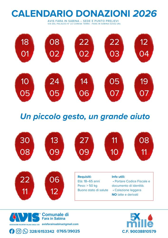 CALENDARIO DONAZIONE SANGUE 2026 Avis Fara in Sabina